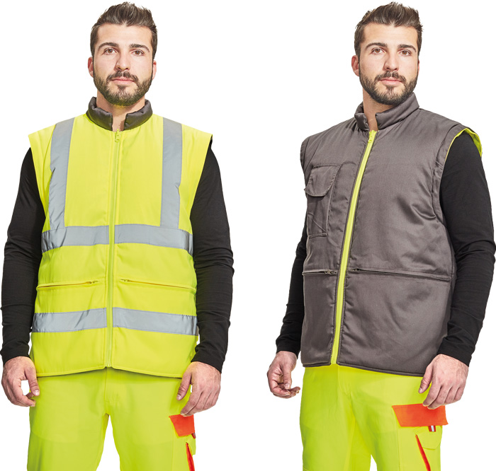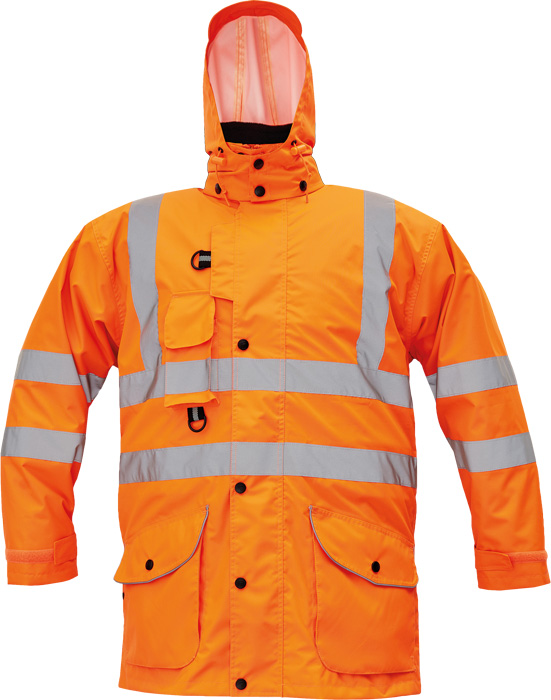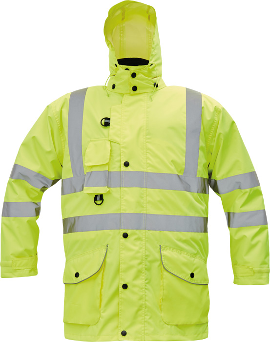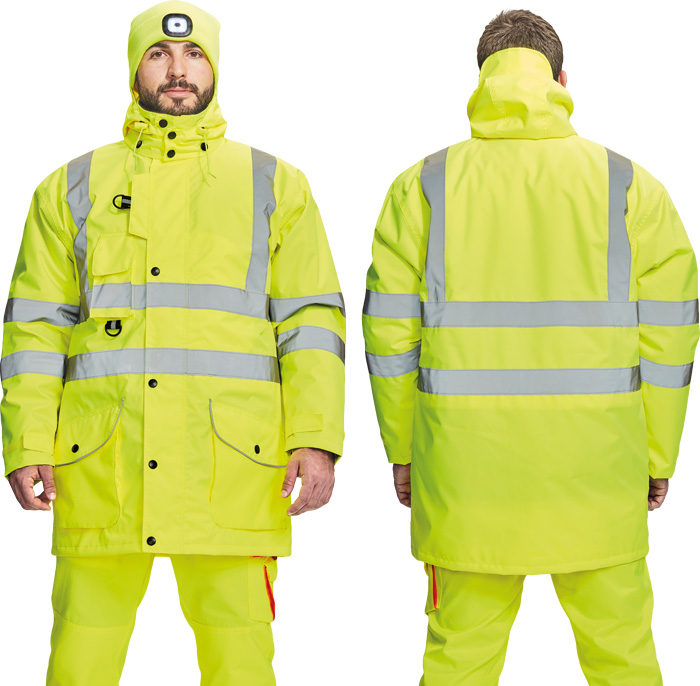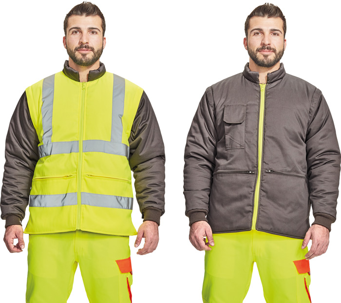 pánská zateplená bunda 7 v 1 s vysokou viditelností s reflexními pruhy; odepínací svrchní větruodolná a voděodolná bunda s lepenými švy a odepínací kapucí; oboustranná samostatná spodní bunda s mnoha multifunkčními kapsami