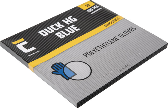 Jednorázové rukavice z modré polyetylénové fólie. Balení lze zavěsit a obsahuje 100 kusů.