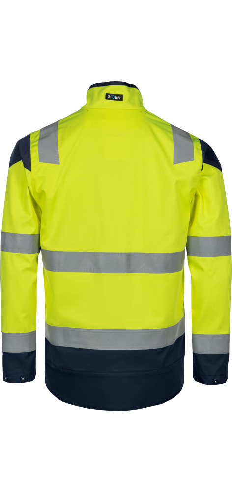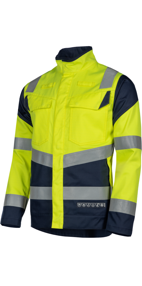 HI-VIS pánská bunda s ARC ochranou; je vyrobena z vysoce prodyšné a velmi lehké (260 g/m²) tkaniny s vynikajícími vlastnostmi regulující vlhkost; rovný límec; zapínání na skryté druky pod klopou; 2 našité náprsní kapsy s klopou zapínanou na skryté druky; 2 našité šikmé kapsy s klopou uzavrenou na skryté druky; 2 smycky pro detektory plynu; prodloužená záda; nehorlavé reflexní pruhy pres ramena, boky a rukávy