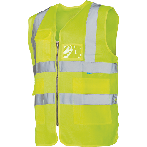 HI-VIS vesta se zapínáním na zip; 1 náprsní kapsa s klopou, 2 boční kapsy s klopami; 1 náprsní kapsa na ID kartu; boční nastavení obvodu v pase pomocí druků.