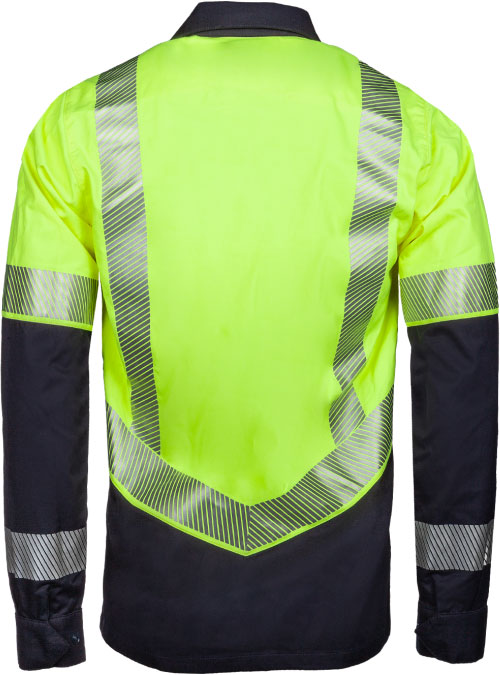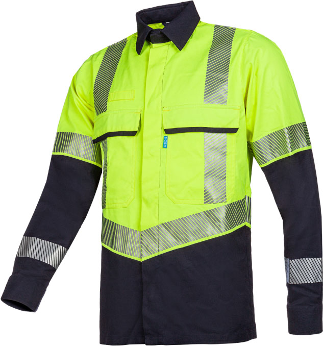 pánská HI-VIS košile s ochranou proti tepelnému účinku elektrického oblouku; antistatická; zapínání na druky pod krycí légou; výborná regulace odvodu vlhkosti; 2 náprsní kapsy s klopou, zapínáním na druky a kontrastním lemováním; segmentované tištěné reflexní pruhy okolo boků, rukávů a přes ramena; spodní obvod rukávů nastavitelný pomocí druků.