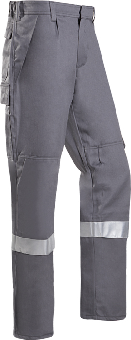 pánské kalhoty s ochranou proti tepelnému účinku elektrického oblouku; antistatické; poklopec se zapínáním na zip; elastický pas; 2 postranní kapsy se zapínáním na druky kryté klopou; 1 zadní kapsa se zapínáním na druky kryté klopou; 1 zadní pravá stehenní kapsa; kolenní kapsy pro vkládání nákoleníků; dvakrát prošité reflexní pruhy odolné proti plameni okolo spodních nohavic; vhodné pro svařování.