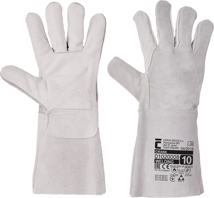Celokožené rukavice z lícové hověziny v dlani, hovězí štípenky na hřbetu, s tuhou 15 cm širokou manžetou, bez podšívky. Certifikát: svářečské práce - typ B