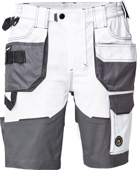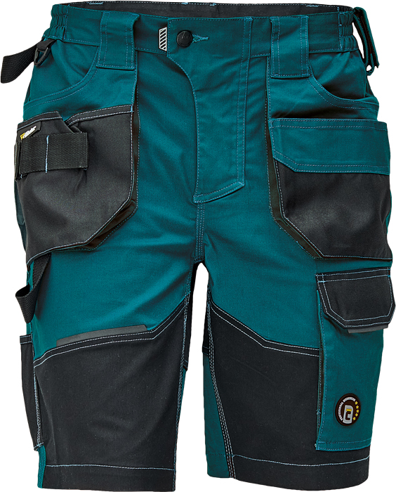 pánské pracovní šortky, elastický inovativní materiál TRIFIBETEX®, ergonomický střih, snížený pružný pas, odolné trojité prošití nohavic a sedu, prostorné multifunkční přední kapsy s poutky na nářadí, 2 zadní kapsy s klopou zesílené Oxfordem, stehenní kapsa na telefon s klopou a zapínáním na suchý zip, kapsa na metr a nůž, poutko na kladivo, "D" kroužek, poutko na nářadí v pase, originální zpracování zapínání kalhot, reflektivní prvky v barevném odstínu