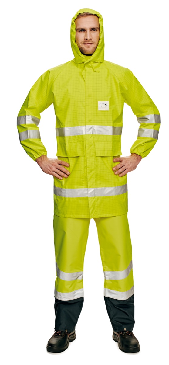 • Hi-Vis plášť do deště s kapucí, zapínání na druky, raglanový střih, re • délka do výšky stehen • antistatický • ochrana proti dešti, vodním postřikům, unikající nebo kapající vodou (pouze pro vodu a nezávadné tekutiny) • antistatické vlastnosti jsou zaručeny pouze při nošení společně s antikalhotami