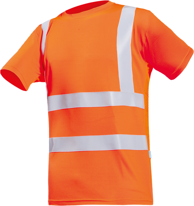 hi-vis tričko se speciálními panely z materiálu mesh v podpaždí; velmi nízká váha; nažehlené reflexní pruhy; anti-bakteriální úprava materiálu s příměsí nano-částeček stříbra