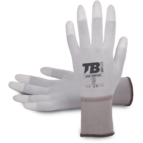 Rukavice z bílého nylonového úpletu. Bílý polyuretanový povlak na konečcích prstů. Pletené zápěstí. Hustota úpletu 13 gg.