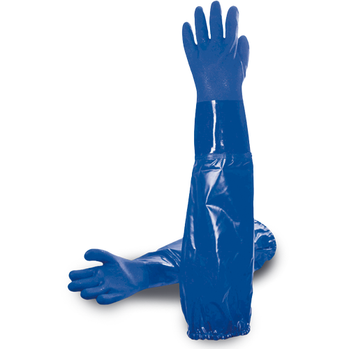 • modrá PVC trojitá máčená rukavice • bezešvá bavlněná vložka • tloušťka: 1,5 mm • celková délka: 62 cm • odolné vůči ropným derivátům a hydroxidu sodnému