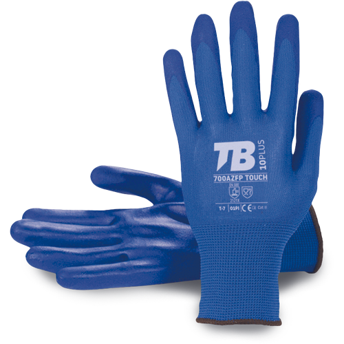 Rukavice z modrého bezešvého nylonu. Modrý pěnový nitril na dlani. Pletené zápěstí. Nitrilová pěna: Ošetření pro minimalizaci zápachu NBR. Velmi vysoká přesnost při manipulaci s malými díly. Vhodné pro manipulaci se všemi druhy potravin: tučné, vodnaté, kyselé...