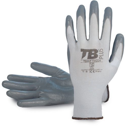 Rukavice z bílého polyesterového úppletu. Šedý nitrilový povlak na dlani. Pletené zápěstí. Hustota úpletu 13 gg.