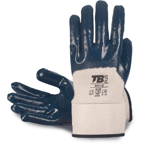 Rukavice s bavlněnou vložkou. Modrý nitrilový 3/4 povlak. Bezpečnostní manžeta 7 cm.