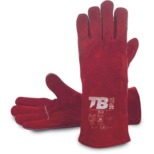 Rukavice z červené hovězí štípenky. Flanelová podšívka. Šité para-aramidovou nití. Tloušťka: 1,2-1,4 mm. Celková délka: 34 cm.