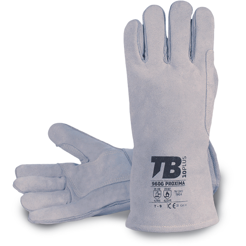 Šedá hovězí kroponová rukavice ze štípenky. Protipožární podšívka. Vyztužení na dlani a palci. Šité para-aramidovou nití. Tloušťka: 1,3 mm. Celková délka: 34 cm. Typ A: doporučeno pro sváření MIG.