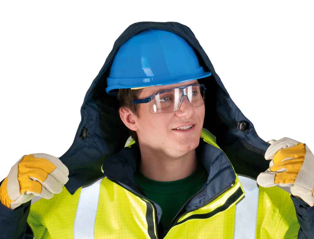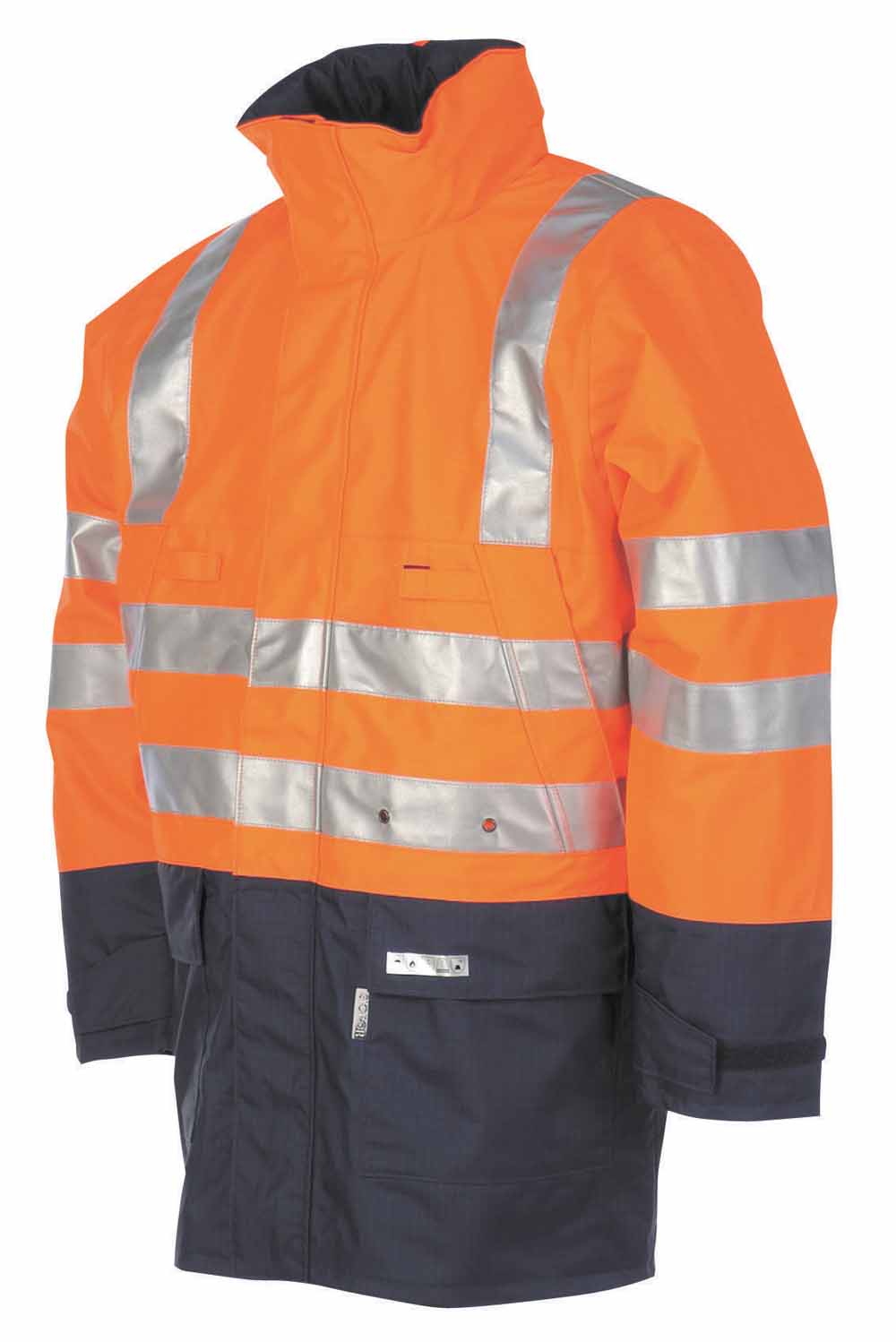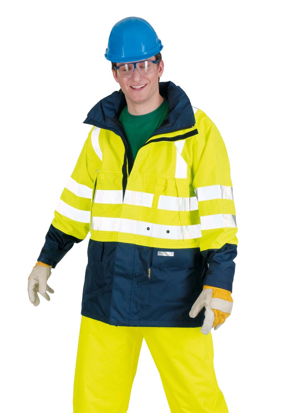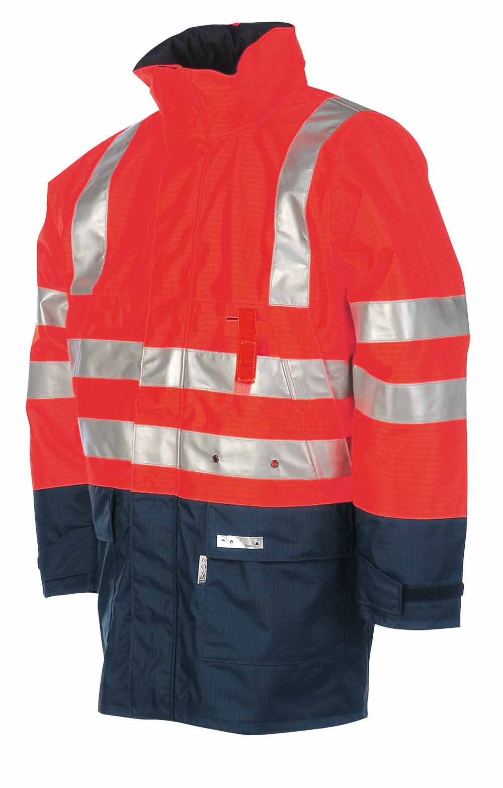 Antistatická, nehořlavá a chemicky odolná bunda s bavlněnou nehořlavou podšívkou, kapucí v límci a přelepenými švy.