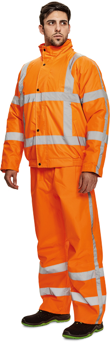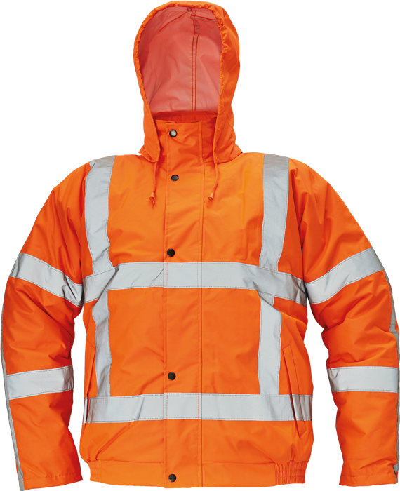 certifikováno dle RIS 3279 TOM pro použití na železnicích; hi-vis bunda s reflexními pruhy; kapuce integrovaná v límci; podlepené švy; reflexní pásky 3M