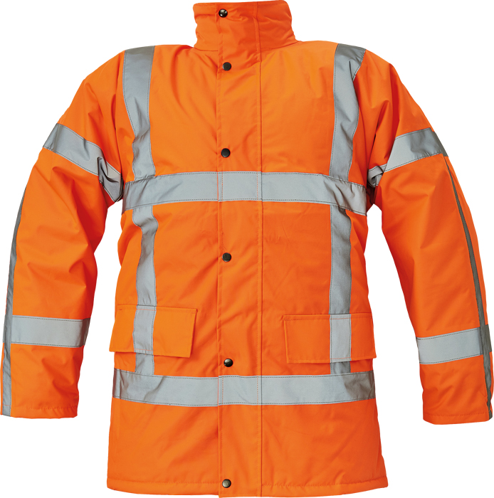 certifikováno dle RIS 3279 TOM pro použití na železnicích; hi-vis zateplená nepromokavá bunda s reflexními pruhy; kapuce integrovaná v límci, obvod je ke stažení na tkaničku; vnitřní pletené manžety; voděodolnost tř. 3 dle normy EN 343 a paropropustnost tř. 1 dle normy EN 343