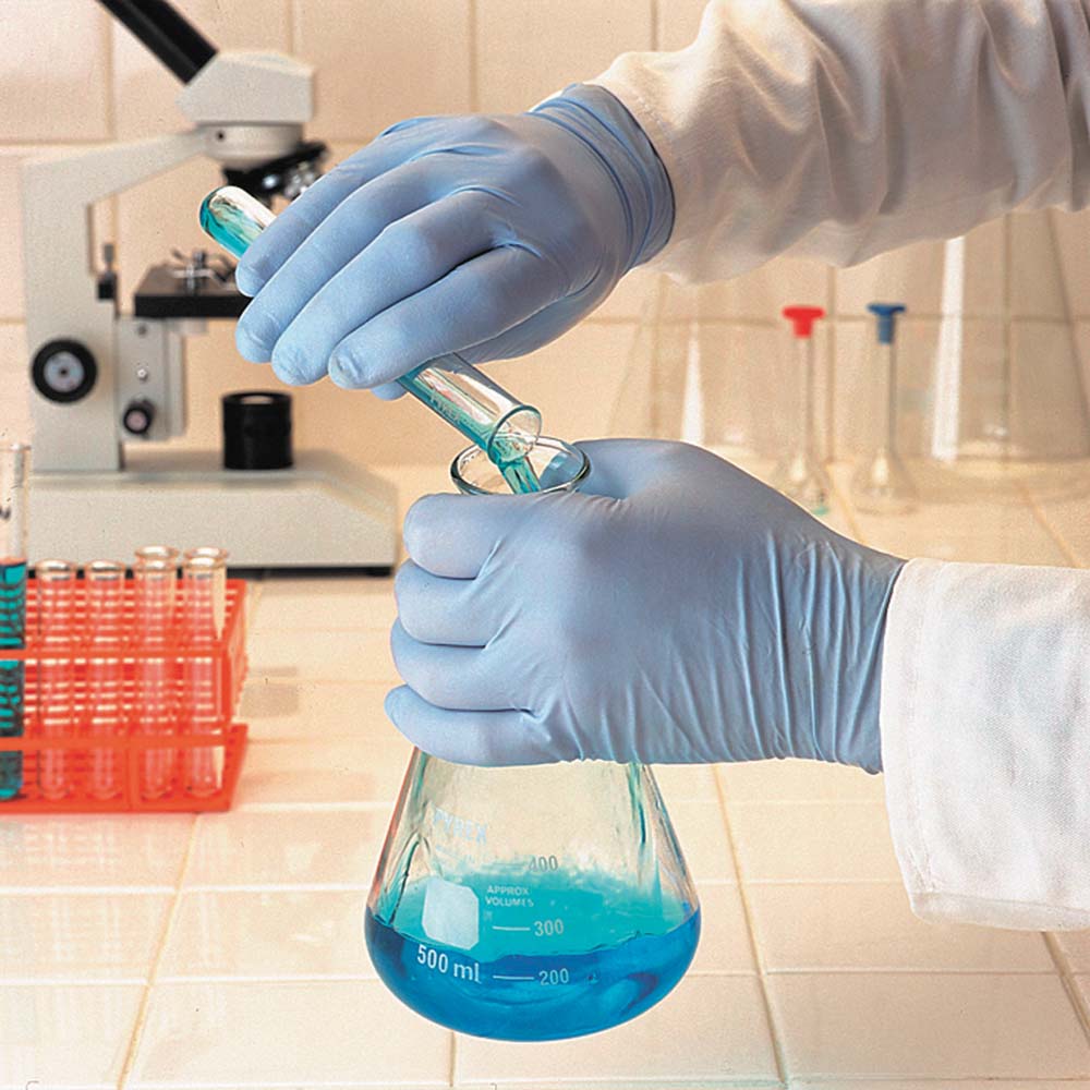 Modré jednorázové nepudrované rukavice ze 100% 0,12 mm silného nitrilu bez příměsí, s rolovaným okrajem, v celkové délce 24 cm.
